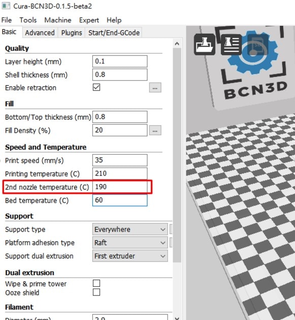 首先,PVA都是打印雙物料時(shí)才會(huì)使用,在3D打印設(shè)定上,190℃的打印噴頭溫度比較適合PVA。第二是打印平臺(tái)最好把它加熱到60℃,與PVA所需的加熱平臺(tái)溫度一樣。如在3D打印軟件CURA設(shè)定這兩個(gè)參數(shù)的話,如下: