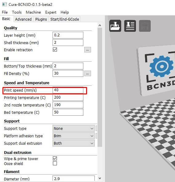 這個不用說大家都知道這兩個功能的英文用來調(diào)校打印噴頭的移動速度,另外,打印速度及行駛速度可以加快到多少很取決于模型大小及復雜性。在CURA 3D打印軟件可在這里設定: