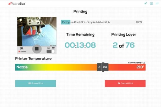 這個(gè)叫AstroBox的小設(shè)備由Raspberry Pi推動(dòng),并附有一個(gè)軟件程式,只要把AstroBox接駁到3D打印機(jī)上,然后再連上兼容Linux系統(tǒng)的鏡頭,用家就可以隨時(shí)隨地遠(yuǎn)端看到3D打印情況,甚至可以把打印狀況拍下。