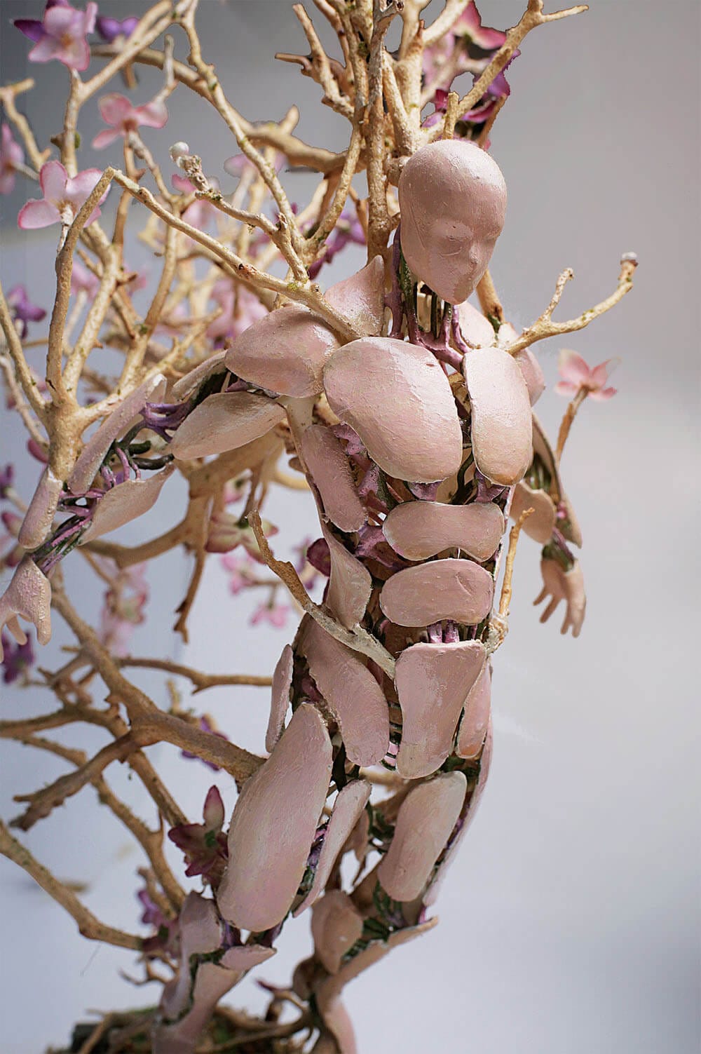 他首先利用一個(gè)叫Zbrush的3D模型設(shè)計(jì)軟件把作品中的人體模型畫出來(lái),然后在把3D人體模型3D打印出來(lái)及涂上顏色。至于植物部分,他采集了真的樹葉,樹枝,花朵,石頭等作藝術(shù)創(chuàng)作材料。所以可以說(shuō)他的藝術(shù)作品結(jié)合了科技(3D打印技術(shù))及大自然(真的植物素材),與作品中人類和大自然融合的題材互相呼應(yīng)。